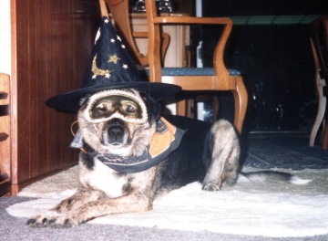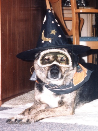 She didn't have any digital photos, just two 5x7 prints of Orphan. She wanted this portrait done in my "Petzazz" style, which was fortunate, because there wasn't enough detail in the photos for me to do anything else. And with Orphan wearing Halloween costumes in both photos, the vibrant, interpretive Petzazz style was definitely in order. Of the two photos, I chose the one that would work best in terms of composition and photo detail & clarity. I scanned both photos at high resolution (the second one as reference, just in case I needed it) and sent them back to my client.