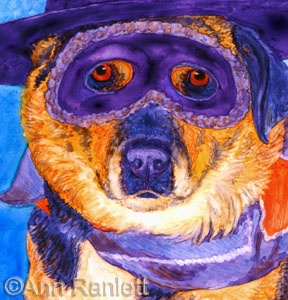 I used a limited color palette of blue, orange & purple. To separate Orphan's coloring from the costume's colors, the dog's dark colors are a more blue-ish purple. After I was finished with painting, I sparingly used color pencil to add depth. I do this on most of my Petzazz paintings. In the detail below, you can see that I used orange color pencil over the purple paint in select spots. I also used purple color pencil over orange paint in other areas of the painting.