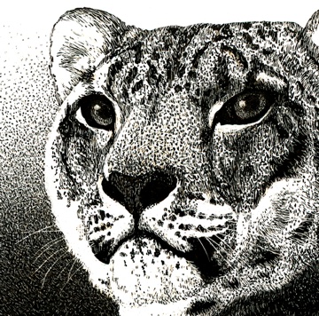 No creative title for this drawing (just called "Snow Leopard"), but I'm very pleased with the result. It's a small drawing - on a 4" x 4" piece of Claybord - but there's still quite a bit of detail. Claybord (yes, that's the correct spelling) is a brand of scratchboard made by Ampersand. I've been using it lately since the scratchboard brands I was using have either changed drastically (EssDee) or are difficult to get (Scratch-Art's Paris professional). I have a stash of the old EssDee and the Paris, but I'm reserving those for pet portrait commissions and special projects. The Ampersand is easy to find and is a nice surface, so I'm using it for not-commissioned pieces such as this leopard and the orangutan. I've also started using it in the classes I teach.