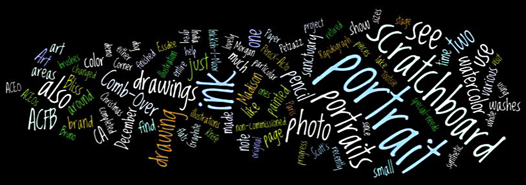 A short post for today. I have other things I need to post (a couple of completed pet portraits and a work in progress video), but they'll take more time than I have right now. So I thought this would be fun to share: I just discovered Wordle - a web site where you can create a nifty word cloud from your own set of words or the words found on a blog or web site with an RSS feed. It's quite customizable, from the "strength" of the words found to the number of words in the cloud to the color scheme.