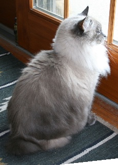 Next is Mr. Fatty, a Munchkin cat (very short legs & stubby tail). This drawing is an ACEO in pencil, with blue color pencil for accent on his eye and the rug. This portrait was commissioned by Mr. Fatty's "aunt" (an artist friend who goes by the name "Golders") for her sister.