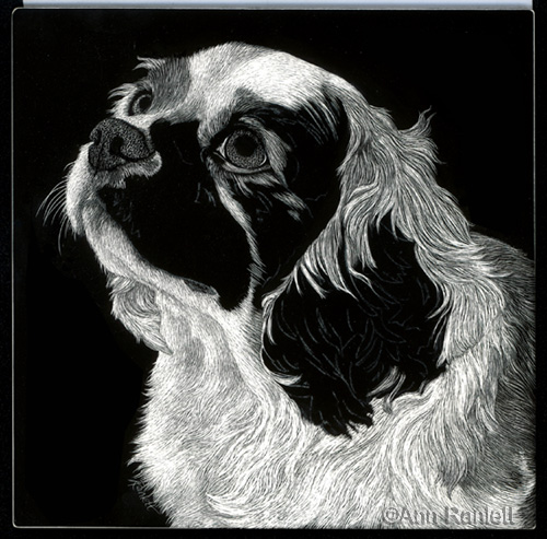 These two portraits were commissioned by a friend for her daughter. Each is 5" x 5" on Ampersand Scratchbord™. After I completed the majority of the scratching on each portrait, I tinted them with colored ink. After adding the color, I do a little more scratching to pull out highlights and tidy things up. I scanned more progress stages of Max's portrait than I did of Rosie's.